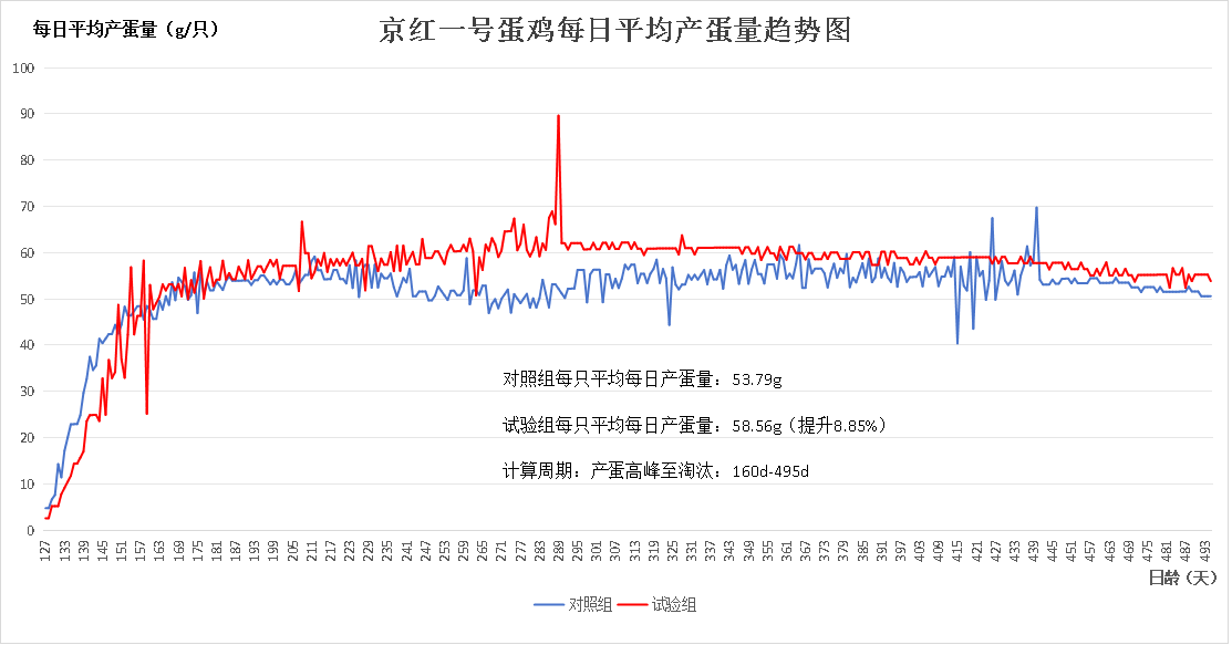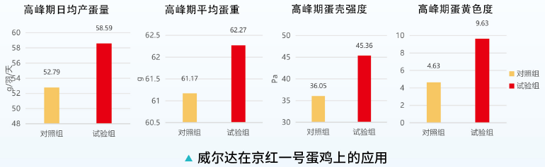 結(jié)論:日糧添加0.05%威爾達(dá)TM產(chǎn)品后,京紅一號(hào)的產(chǎn)蛋高峰明顯延長,平均產(chǎn)蛋量提高10.99%,平均蛋重提高1.80%,蛋殼強(qiáng)度提高25.83%,蛋黃色度提高107.99%。說明使用威爾達(dá)TM系列產(chǎn)品能夠顯著提高蛋雞生產(chǎn)性能,提高收益。