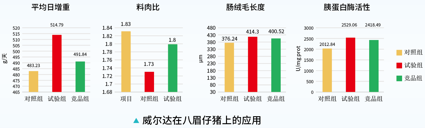 結(jié)論:日糧添加0.05%威爾達(dá)產(chǎn)品后,相較于對照組,仔豬平均日增重提高了6.53%,料肉比降低5.46%,絨毛長度提高10.12%,腸道胰蛋白酶活性提高25.65%。顯著提高了生長性能,節(jié)約飼料成本,提高效益。